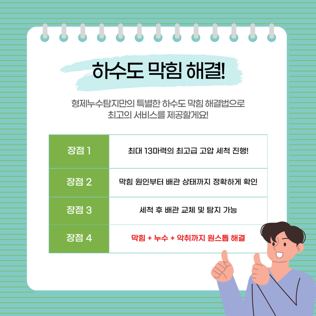 이제 막힌 하수도, 형제누수탐지가 완벽하게 뚫어드립니다!